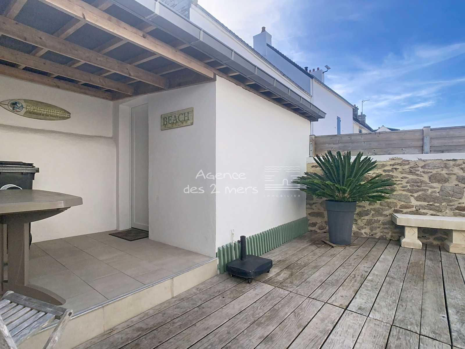 Cour pavée à l'Est et spacieuse terrasse entièrement cloturée à l'Ouest, avec un porche et une dépendance pour ranger vélo, planches, mobilier d'extérieur, etc...