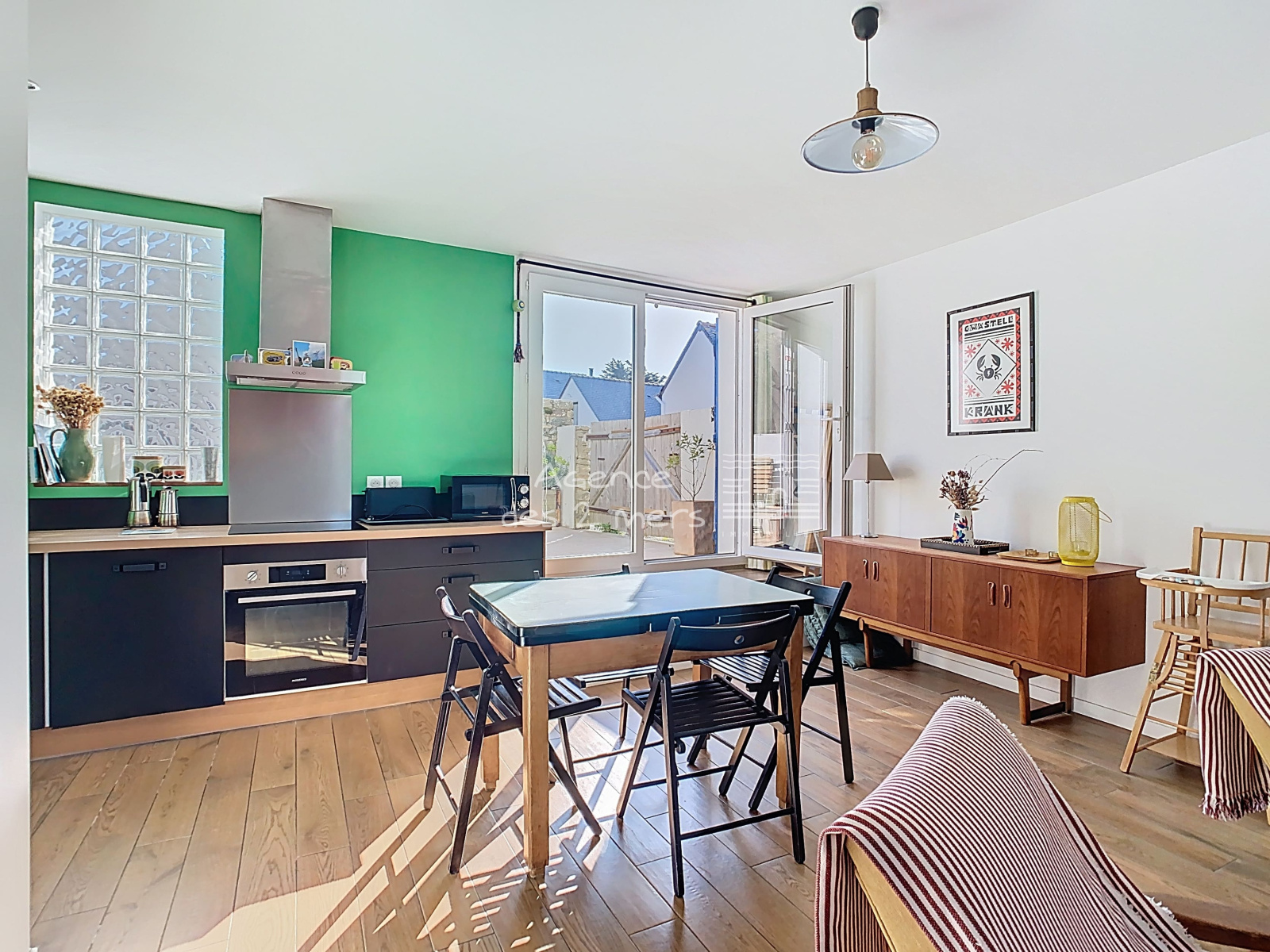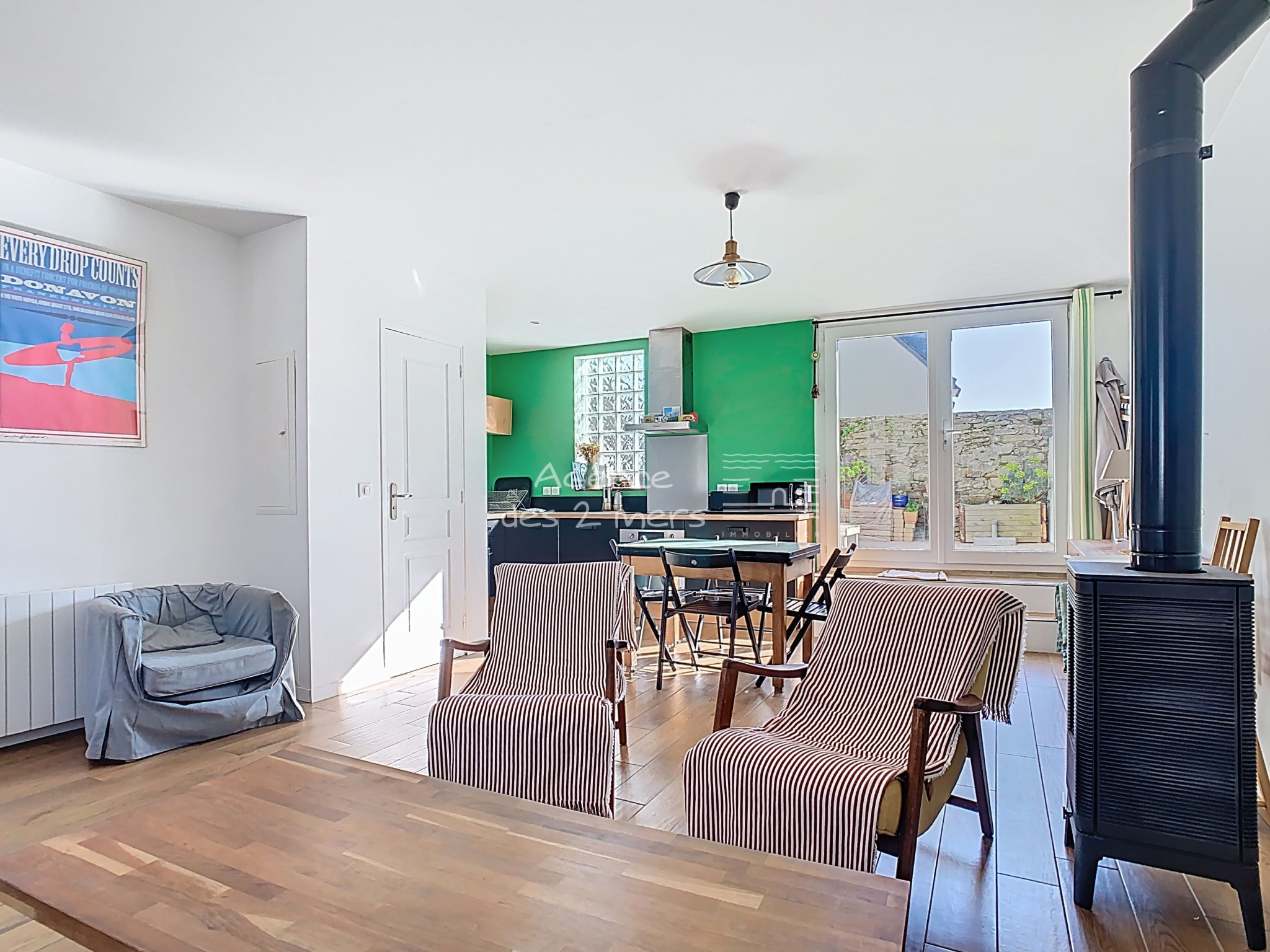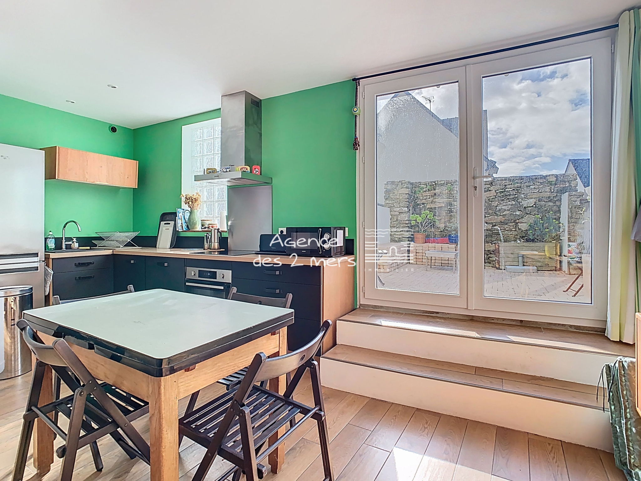 Quiberon (56170)Au coeur d'un charmant village typique de la Côte Sauvage, Maison de pêcheur reconstruite en 2016, comprenant au rez-de-chaussée : une entrée sur agréable pièce de vie avec poêle à bois cuisine aménagée ouverte donnant sur terrasse (cour fermée) orientée plein Sud, wc sous escalier ; A l’étage : palier desservant 3 chambres (2 chambres + une chambrette) et salle de bains avec wc. Grenier sous pentes. En complément : un Garage non attenant, construite en parpaings et pierres, couvert en ardoises.